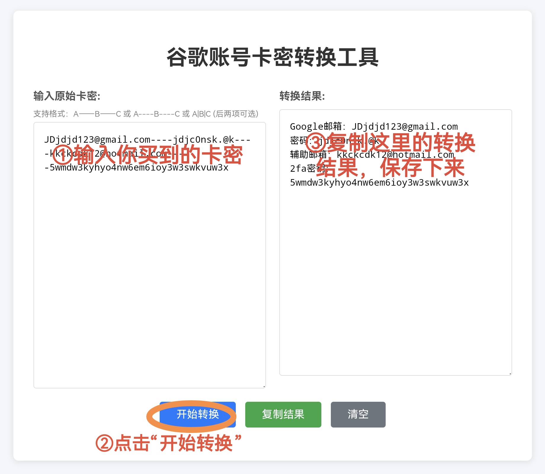 1.首先将买到的卡密复制到kami.952134.xyz中进行转换
