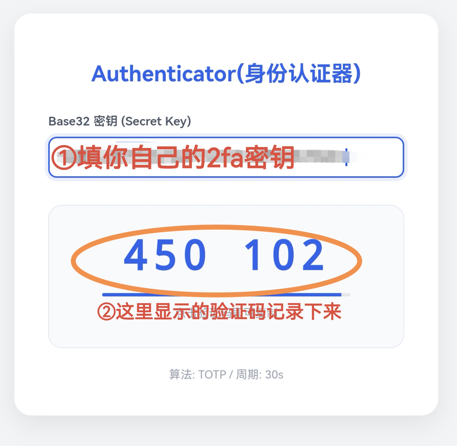 4.打开2fa.oihao.com,填入【2fa密钥】,下方会显示验证码